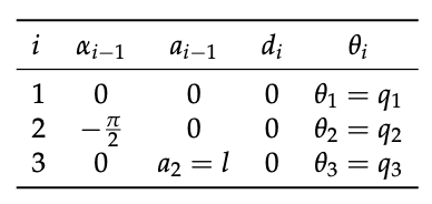 \[{}_1 \mathbf{D}_2 = \begin{bmatrix} c q_3 & -s q_3 & 0 & l \\ s q_3 & c q_3 & 0 & 0 \\ 0 & 0 & 1 & 0 \\ 0 & 0 & 0 & 1 \end{bmatrix}\]이렇게 쭉쭉 계산이 가능하다. 참고로 \({}_1 \mathbf{D}_3\)는 \({}_1 \mathbf{D}_2 {}_2 \mathbf{D}_3\) 로 계산 가능하다.