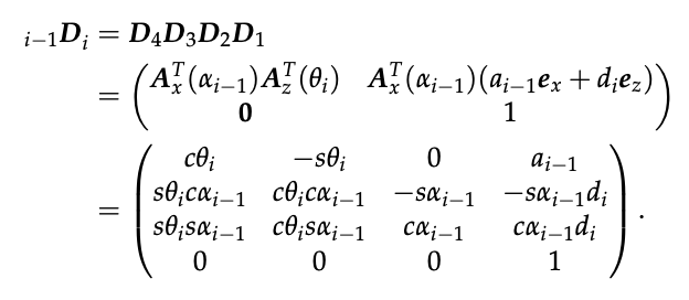 \[D_4 = \begin{bmatrix} A_x (-\alpha_{i-1}) & \mathbf{0} \\ \mathbf{0} & \mathbf{1} \end{bmatrix}\]Somit ergibt sich die resultierend homogene Transformation zu:
