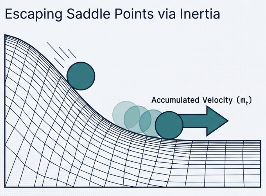 - Allows the optimizer to overshoot saddle points even when the current gradient is zero.