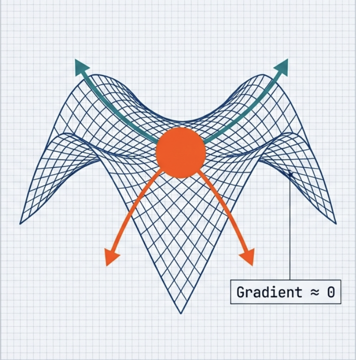 딥러닝의 고차원 loss landscape 에서는 local minimum 보다 saddle point 가 훨씬 더 흔하다.