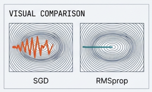 \[v_t = \beta v_{t-1} + (1- \beta) g_t^2\]RMSprop keeps a moving average of squared gradients. (Variance, Size 정보) It normalizes step size individually for each parameter, taming the zig-zag oscillation