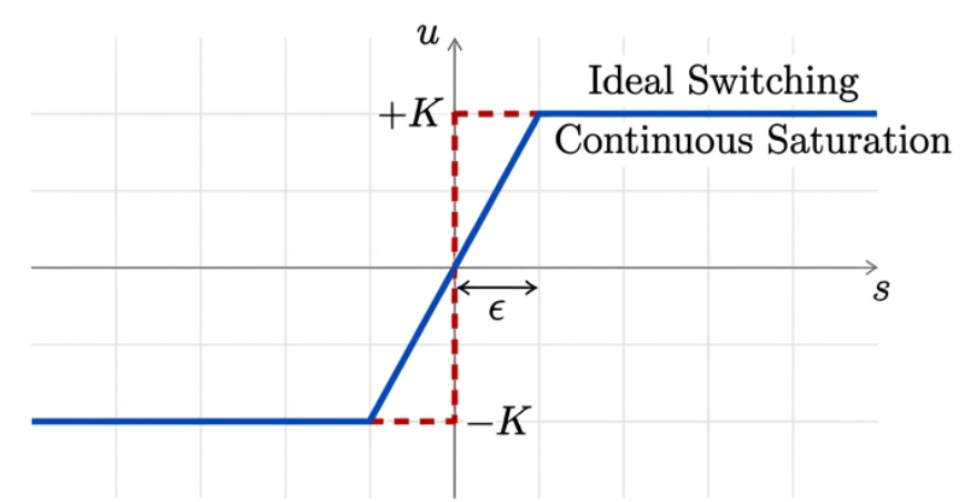 이렇게 두 가지로 나눌 수 있다. 이 방식은 Chattering 을 줄여주지만, 상태를 \(s=0\) 에 완전히 고정시키는 대신 평면 근처의 일정한 Neighborhood 내로 수렴시키는 특성을 가진다.